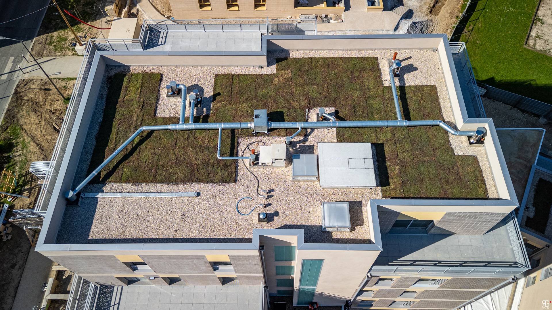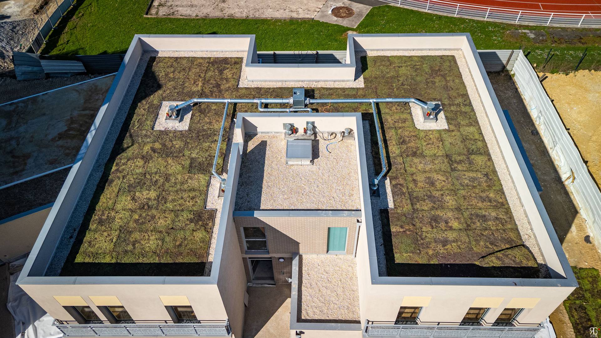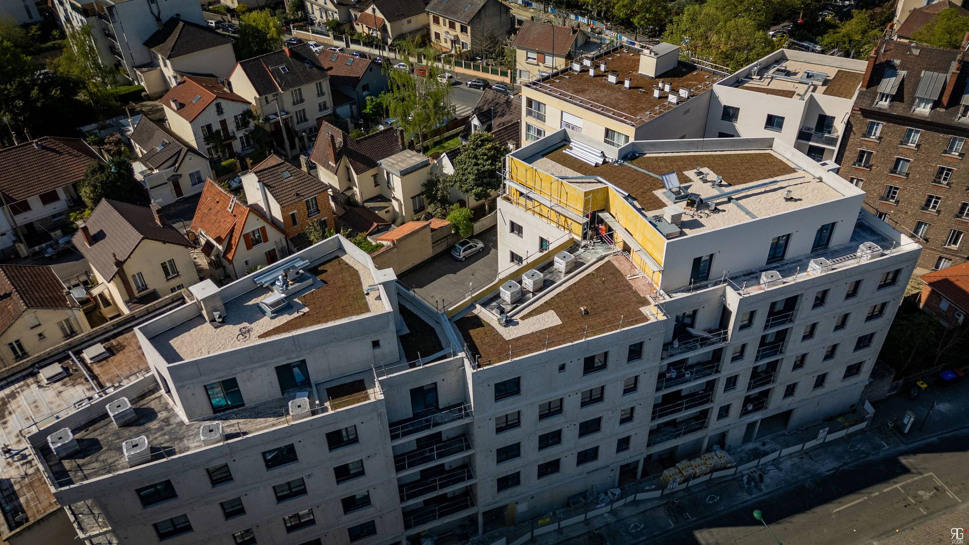 Transformation de toitures-terrasses en toitures végétalisées extensives. Étanchéité sous végétalisation, couche drainante, substrat et plantes adaptées. Amélioration de la gestion des eaux pluviales.